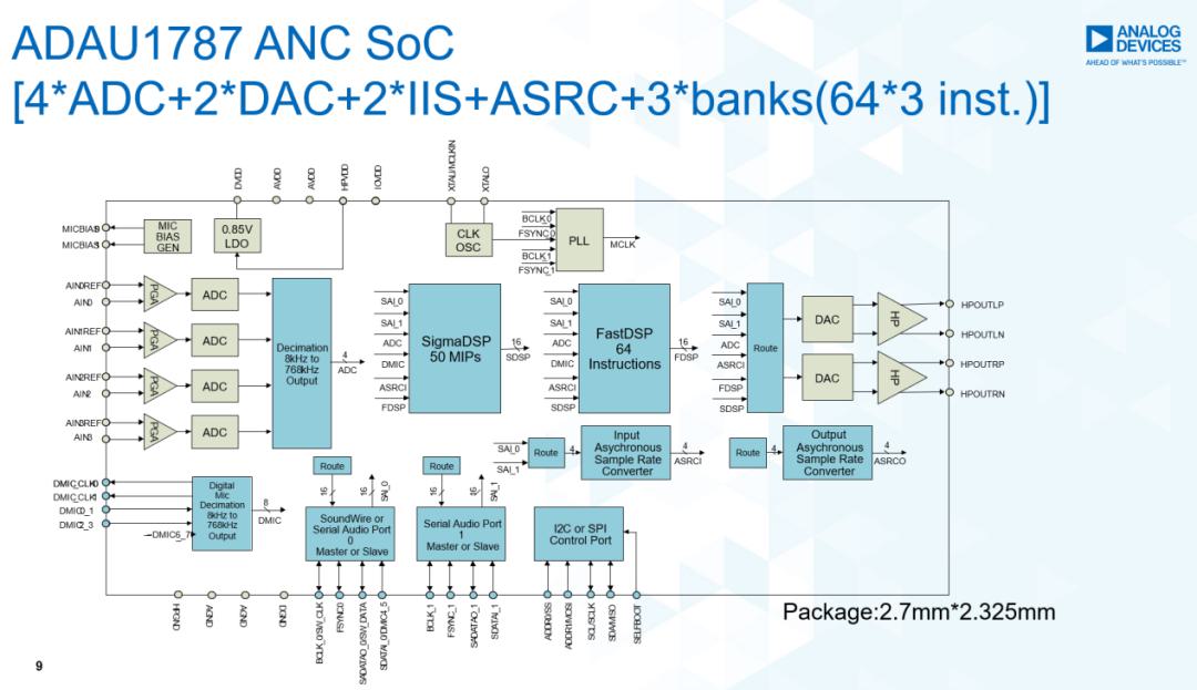 以ADAU1787為例,ADI提供了4路ADC輸入接口和4路數(shù)字麥克風(fēng)輸入,且這些輸入口是并行輸入,因此ADAU1787可以實現(xiàn)單芯片應(yīng)用于混合(hybrid)降噪耳機。同時,ADAU1787具有獨特的雙核設(shè)計,其中FastDSP核用于主動降噪濾波器處理,SigmaDSP核做EQ后處理,這種設(shè)計能夠?qū)翟胩幚砗髶p失的低頻部分做補償。此外,ADAU1787還能提供2.3*2.8 mm的BGA封裝,在1.8V供電下功耗僅約為6-7mW,可以應(yīng)用于對功耗和芯片體積要求更嚴苛的TWS耳機中。在與客戶共同合作定義新產(chǎn)品時,還可以通過減去冗余的功能模塊,進一步降低功耗。