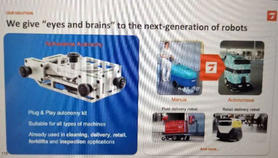 衍生于蘇黎世聯(lián)邦理工學(xué)院的Sevensense致力于用移動機(jī)器人取代人工地面機(jī)械,如叉車、運(yùn)輸或清潔工具等。Sevensense 的主要產(chǎn)品為 Alphasense Autonomy,它是一款用于移動機(jī)器人的即插即用型自動導(dǎo)航套件,基于其獨(dú)有的高級機(jī)器學(xué)習(xí)和計算機(jī)視覺技術(shù),它可以被靈活部署在多種平臺和應(yīng)用中。