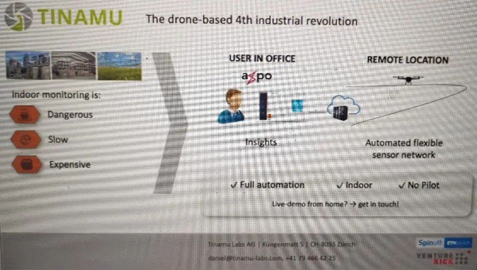 另一家衍生于蘇黎世聯(lián)邦理工的機(jī)器人初創(chuàng)公司Tinamu則聚焦無人機(jī)功能原型。Tinamu把連通云端的無人機(jī)變?yōu)殪`活的傳感器網(wǎng)絡(luò),可在所有環(huán)境,包括室內(nèi)實現(xiàn)檢查工作流程和數(shù)據(jù)采集自動化。他們的解決方案包括用戶界面(儀表板)、分析軟件(支持專有和第三方軟件)以及遠(yuǎn)程無人機(jī)系統(tǒng)。用戶可在總部就可遠(yuǎn)程啟動無人機(jī),無人機(jī)就可在遠(yuǎn)程位置進(jìn)行工作,獲取數(shù)據(jù)后,再在云端分析處理數(shù)據(jù),并將信息返回給用戶。