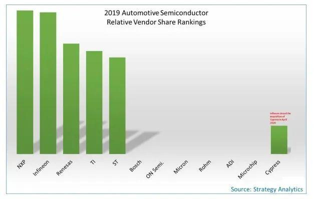 據(jù)Strategy Analytics研究數(shù)據(jù)顯示,在2019年汽車半導(dǎo)體廠商市場(chǎng)份額排行榜中,恩智浦榮登榜首。