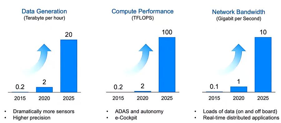我們可以將汽車看做一個(gè)大型物聯(lián)網(wǎng)設(shè)備,傳感器在使用過程中會(huì)產(chǎn)生大量數(shù)據(jù),這就需要處理系統(tǒng)擁有很強(qiáng)的運(yùn)算能力。出于對(duì)安全等各方面的巨大需求,汽車內(nèi)部集成的軟件非常多,且隨著未來的發(fā)展,軟件數(shù)量可能會(huì)持續(xù)直線型增長(zhǎng)。