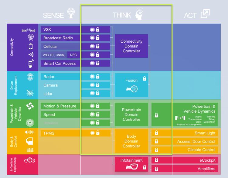 目前汽車已經(jīng)實(shí)現(xiàn)了從“每一個(gè)應(yīng)用都是一個(gè)處理系統(tǒng)”到控制域的演進(jìn)。汽車內(nèi)部有5個(gè)重要控制域,包括動(dòng)力傳動(dòng)、車身、連接、自動(dòng)化、車載信息娛樂等,恩智浦在其中扮演了非常重要的角色。