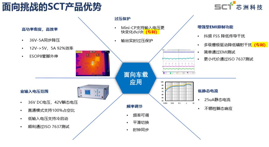 汽車一級電源DC/DC轉(zhuǎn)換芯片需具備高效率高功率密度、寬輸入電壓范圍、低靜態(tài)電流、低EMI特性與高可靠性,這對廠商來說也是挑戰(zhàn)。針對這些需求,芯洲科技推出面向應(yīng)用的SCT解決方案。
