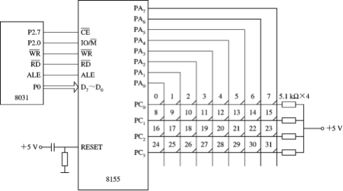 圖 7.26 是采用 8155 接口芯片構(gòu)成 8×4 鍵盤的接口電路,其中 A 口為輸出,作為行線;C 口為輸入,作為列線。