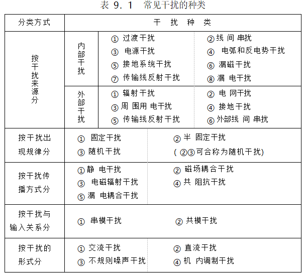 另外,干擾還可以從形式、產(chǎn)生和傳播方式等方面進行分類,參見表 9.1 。盡管干擾的分類多種多樣,在單片機應(yīng)用系統(tǒng)中,我們將以干擾傳播方式分類方法為主,討論串模干擾和共模干擾的抑制方法。