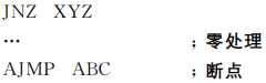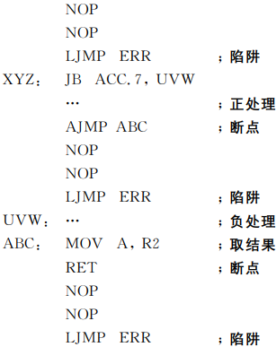 程序區(qū)是由一系列的指令構(gòu)成的,不能在這些指令中間任意安排陷阱,否則會(huì)破壞正常的程序流程。但是,在這些指令中間常常有一些斷點(diǎn),正常的程序執(zhí)行到斷點(diǎn)處就不再往下執(zhí)行了,這類指令有LJMP、SJMP、AJMP、RET、RETI,這時(shí)PC的值應(yīng)發(fā)生正常跳變。如果在這些地方設(shè)置陷阱就有可能捕捉到“跑飛”的程序。例如,對(duì)一個(gè)累加器A的內(nèi)容的正、負(fù)和零的情況進(jìn)行三分支的程序,軟件陷阱安排如下: