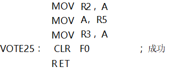 首先將要恢復(fù)的單字節(jié)信息及它的兩個(gè)備份信息分別存放到工作寄存器R2、R3和R4中,再調(diào)用表決子程序。子程序出口時(shí),若F0=0,表示表決成功,即三個(gè)數(shù)據(jù)中有兩個(gè)是相同的;若F0=1,表示表決失敗,即三個(gè)數(shù)據(jù)互不相同。表決結(jié)果存放在累加器A中,程序如下: