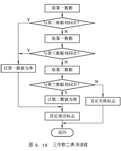系統(tǒng)中的信息是以代碼形式存放在RAM中的,為了使這些信息在受到破壞后能得到正確的恢復(fù),存放系統(tǒng)信息時(shí)應(yīng)該采取代碼冗余措施。下面介紹一種三重冗余編碼,它是將每個(gè)重要的系統(tǒng)信息重復(fù)存放在三個(gè)互不相關(guān)的地址單元中,建立雙重?cái)?shù)碼備份。當(dāng)系統(tǒng)受到干擾后,就可以根據(jù)這些備份的數(shù)據(jù)進(jìn)行系統(tǒng)信息的恢復(fù)。這三個(gè)地址應(yīng)盡可能地獨(dú)立,如果采用了片外的RAM,則應(yīng)在片外RAM中對(duì)重要的系統(tǒng)信息進(jìn)行雙重?cái)?shù)據(jù)備份。片外RAM中的信息只有MOVX指令才能對(duì)它進(jìn)行修改,而能夠修改片內(nèi)RAM中信息的指令則多得多,因此在片外RAM中進(jìn)行雙重?cái)?shù)據(jù)備份是十分必要的。通常將片內(nèi)RAM中的數(shù)據(jù)供程序使用以提高程序的執(zhí)行效率,當(dāng)數(shù)據(jù)需要進(jìn)行修改時(shí)應(yīng)將片外RAM中的備份數(shù)據(jù)作同樣的修改。在對(duì)系統(tǒng)信息進(jìn)行恢復(fù)時(shí),通常采用圖9.14所示的三中取二的表決流程。