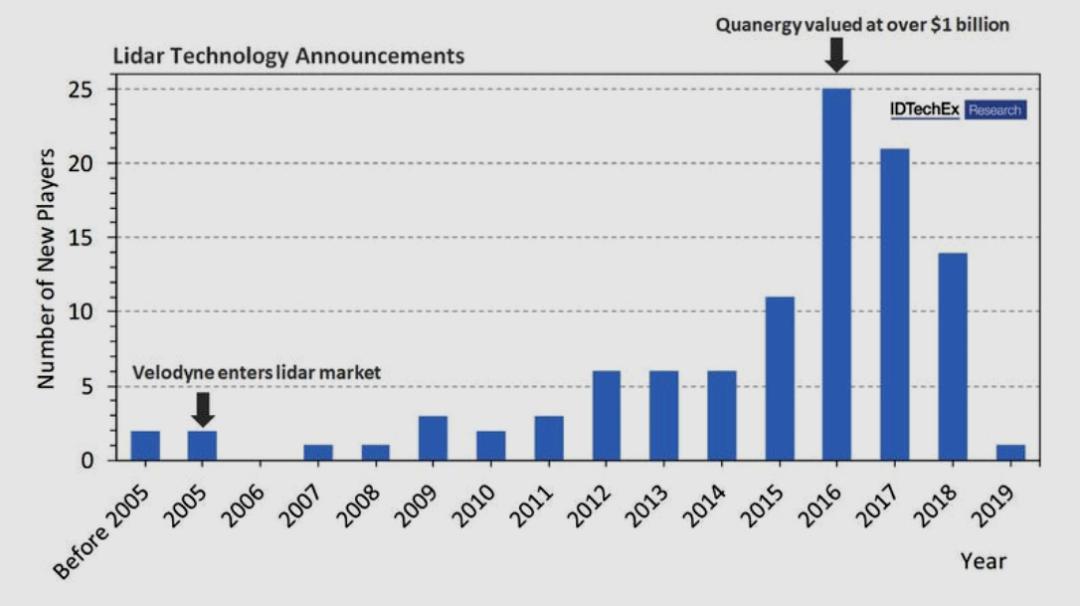 從技術(shù)咨詢(xún)公司IDTechEx的統(tǒng)計(jì)來(lái)看,近15年來(lái),3D Lidar技術(shù)從無(wú)到有,經(jīng)歷了2016年入場(chǎng)公司數(shù)登頂?shù)娘L(fēng)光,現(xiàn)在已進(jìn)入技術(shù)積淀淘汰階段,再想進(jìn)入這個(gè)市場(chǎng)已經(jīng)不太容易,因?yàn)樗呀?jīng)飽和。