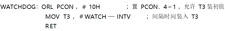 在用戶程序中,間隔調(diào)用“看門狗”子程序LCALL WATCHDOG指令,以便程序在正常運(yùn)行時(shí)能在指定的時(shí)間內(nèi)(監(jiān)視時(shí)間間隔)重新裝入監(jiān)視定時(shí)器T3,使監(jiān)視電路不產(chǎn)生內(nèi)部系統(tǒng)復(fù)位信號(hào),從而使程序得到正確的運(yùn)行。