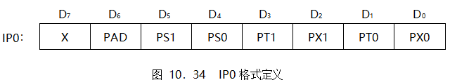 中斷優(yōu)先級由兩個特殊功能寄存器IP0和IP1控制。IP0的地址為B8H,其格式如圖10.34所示。