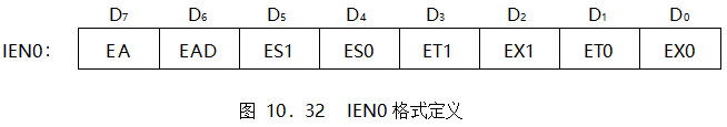 中斷的允許由兩個特殊功能寄存器IEN0和IEN1控制。IEN0的地址為A8H,格式如圖10.32所示。