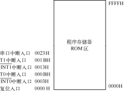 INT1、T1和串口中斷,它們的中斷服務處理程序在ROM中的存放地址分別為0003H、000BH、0013H、001BH和0023H,這些地址被稱為中斷服務處理程序的入口地址,如圖2-8所示。程序存儲器的地址0000H對應于復位入口,即主程序的入口,單片機開始工作時將首先從程序存儲器中地址為0000H的存儲單元中取指令的。