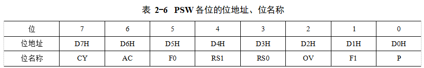 PSW(見表2-6)可以記錄指令的執(zhí)行結(jié)果狀態(tài),比如:加法運算是否產(chǎn)生進位、借位等。PSW中各位的作用如下: