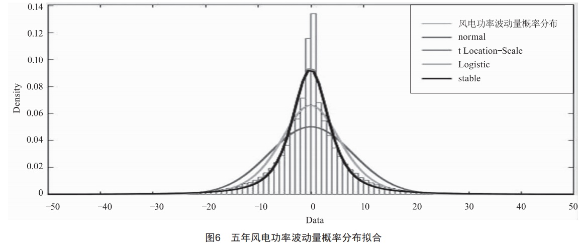 本文分別利用正態(tài)分布、t Location-Scale分布、Logistic分布、stable分布對(duì)風(fēng)速波動(dòng)量概率密度和風(fēng)電功率波動(dòng)量概率密度進(jìn)行擬合,結(jié)果顯示: