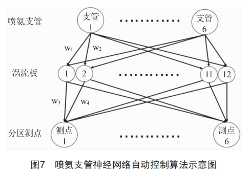 通過上述試驗可發(fā)現(xiàn),調(diào)整分支噴氨量,對應(yīng)脫硝出口分區(qū)No王濃度變化最大,且呈發(fā)散性對附近的分區(qū)產(chǎn)生影響。因此引入神經(jīng)網(wǎng)絡(luò)自動控制算法,對各噴氨支管調(diào)門進行實時調(diào)整,如圖7所示。