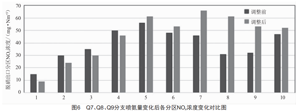 (2)將07、08、09分支噴氨調(diào)門開度由100%關(guān)小至60%,記錄調(diào)整前后脫硝出口各分區(qū)NoX濃度數(shù)據(jù),如圖6所示。