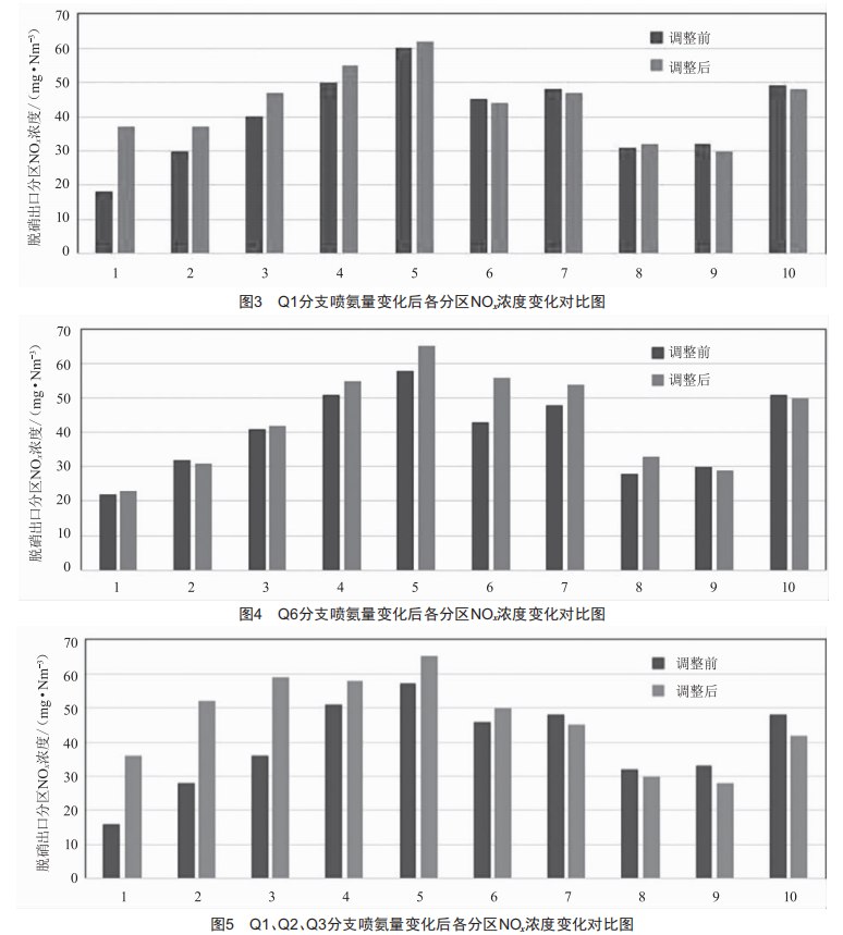 (1)將01、02、03分支噴氨調(diào)門開度由100%關(guān)小至60%,記錄調(diào)整前后脫硝出口各分區(qū)NoX濃度數(shù)據(jù),如圖5所示。