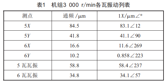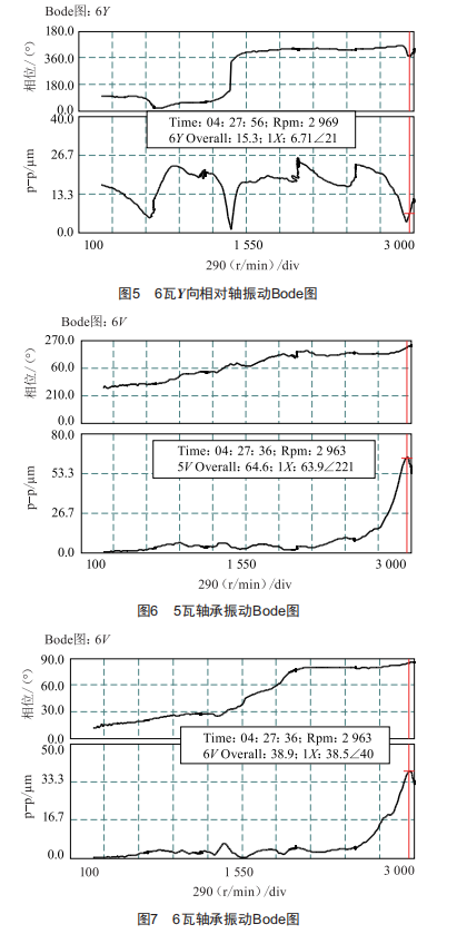 (3)5、6瓦軸承振動(dòng)在2700r/min轉(zhuǎn)速下快速增大,2963r/min轉(zhuǎn)速下達(dá)到最大值,工作轉(zhuǎn)速下,5瓦軸承振動(dòng)超標(biāo);