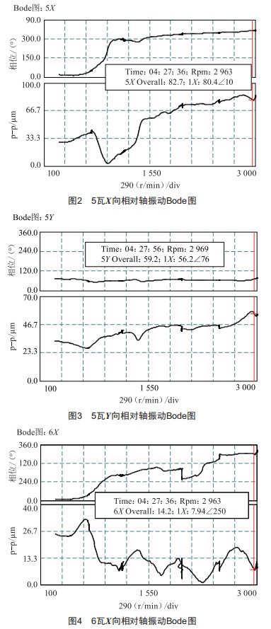 圖8與圖9為檢修前5、6瓦軸承振動(dòng)Bode圖,可以看出,檢修前,3000r/min左右未出現(xiàn)峰值,說明檢修后,發(fā)電機(jī)軸承支承剛度降低,產(chǎn)生結(jié)構(gòu)共振現(xiàn)象,引起發(fā)電機(jī)軸承振動(dòng)超標(biāo)現(xiàn)象。