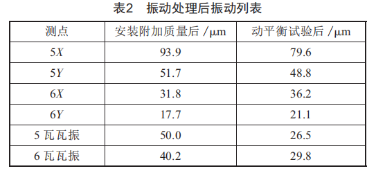 發(fā)電機(jī)臺(tái)板與水泥基礎(chǔ)連接狀況不良和發(fā)電機(jī)端蓋安裝翹曲均會(huì)造成支承剛度降低,引起結(jié)構(gòu)共振現(xiàn)象?,F(xiàn)場(chǎng)緊固發(fā)電機(jī)地腳螺栓,振動(dòng)無明顯改善:重新安裝調(diào)整發(fā)電機(jī)端蓋,時(shí)間長,影響發(fā)電企業(yè)生產(chǎn)效益,且效果存在不可預(yù)見性。而在發(fā)電機(jī)定子及氫冷器上安裝附加質(zhì)量,通過附加質(zhì)量吸收振動(dòng)能量,能夠降低發(fā)電機(jī)軸承振動(dòng)。實(shí)際中,采用在發(fā)電機(jī)定子及氫冷器上放置沙袋的方式,總重量約為3t,5瓦軸承振動(dòng)降低至50um以內(nèi)(表2)。