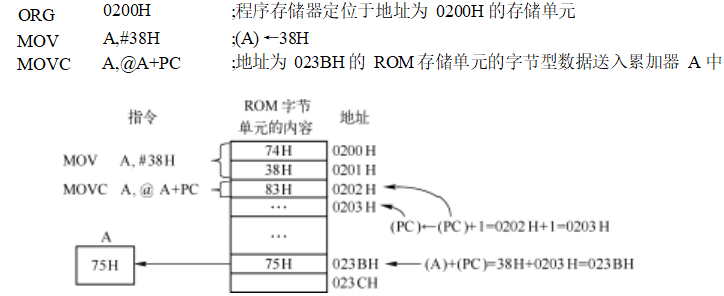 在表3-6中,“(PC)←(PC)+1”內(nèi)的第二個“(PC)”是指令“MOVC A,@A+PC”在ROM中的存放地址,第一個“(PC)”是指令“MOVC A,@A+PC”的“當前PC值”,即存儲器中緊鄰指令“MOVC A,@A+PC”存放的下一條(存放地址更大的)指令的存放地址。