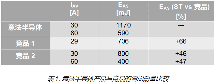 表1詳細(xì)比較了意法半導(dǎo)體STL325N4LF8AG與主要競(jìng)爭(zhēng)對(duì)手的等效 AEC Q101 MOSFET的雪崩耐量。