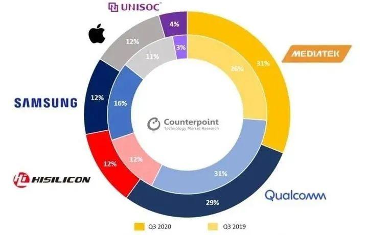 而在2020年,隨者5G時(shí)代的來(lái)臨以及一些新興市場(chǎng)的崛起,聯(lián)發(fā)科的市占率又開始攀升。根據(jù)市場(chǎng)研究機(jī)構(gòu)Counterpoint Research的數(shù)據(jù)顯示,在2020年第三季度,聯(lián)發(fā)科以31%的市占率首度超過(guò)高通的29%的市占率,成為全球最大的智能手機(jī)芯片廠商。尤其在印度、拉美以及中東非洲等市場(chǎng),聯(lián)發(fā)科表現(xiàn)搶眼。