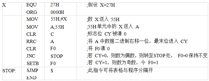 【例3-58】判斷單字節(jié)數(shù)的奇偶性。要求:單字節(jié)數(shù)X存放于片內(nèi)RAM地址為55H的存儲單元中,判斷其奇偶性,若其為奇數(shù)則將PSW寄存器中的F0置1,否則將F0清0。