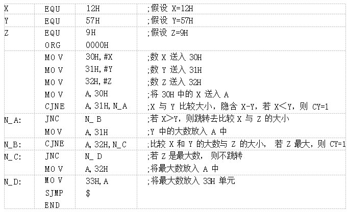 【例3-60】求三個無符號字節(jié)型數(shù)據(jù)X、Y和Z中的最大值。要求:X、Y和Z分別存放于片內(nèi)RAM的30H、31H和32H單元,最大值存于33H單元。