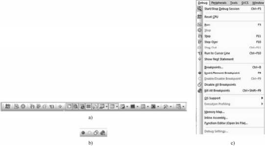 a)調(diào)試用快捷圖標(biāo)欄b)斷點(diǎn)控制快捷圖標(biāo)c)“Debug”菜單