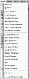 進(jìn)入調(diào)試環(huán)境后,可以通過(guò)鼠標(biāo)單擊“View”菜單(見(jiàn)圖7-21)下的子菜單打開(kāi)各種調(diào)試用的觀(guān)察窗口(Window),也可以通過(guò)鼠標(biāo)左鍵單擊圖7-17a所示的快捷圖標(biāo)打開(kāi)這些窗口。