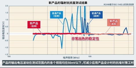 不僅如此,新產(chǎn)品還具有出色的抗干擾能力,在 ISO 11452-2輻射抗擾度測(cè)試(用來(lái)評(píng)估抗干擾能力的國(guó)際標(biāo)準(zhǔn))中,在測(cè)試范圍內(nèi)的各個(gè)頻段,輸出電壓波動(dòng)量均在50mV以下(±1%以內(nèi)),因此可以減少應(yīng)用產(chǎn)品設(shè)計(jì)時(shí)的抗噪對(duì)策工時(shí)。