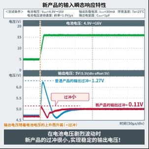 新產(chǎn)品不僅體積小巧(2.9mm×2.8mm),還實(shí)現(xiàn)了高耐壓(Max.=45V)和低消耗電流(Typ.=6μA),可滿足構(gòu)建需要持續(xù)工作的冗余電源時(shí)的主要需求。另外,利用ROHM擅長(zhǎng)的模擬控制技術(shù),使得在電池電壓劇烈波動(dòng)的情況下也能確保穩(wěn)定的輸出電壓。在相同條件下進(jìn)行比較時(shí),普通產(chǎn)品會(huì)出現(xiàn)最大超過(guò)1.2V的過(guò)沖,因此需要通過(guò)添加大容量輸出電容器等方法來(lái)防止電壓超過(guò)輔助微控制器等后級(jí)器件的額定電壓。新產(chǎn)品的過(guò)沖僅為0.1V左右,因此支持輸出電容器的小型化。與使用普通產(chǎn)品的冗余電源電路相比,使用新產(chǎn)品時(shí)電路板面積還可縮減約29%,從而能夠通過(guò)添加更小規(guī)模的電路來(lái)構(gòu)建冗余電源。此外,新產(chǎn)品還具有出色的抗干擾能力,在ISO 11452-2輻射抗擾度測(cè)試中,輸出電壓在測(cè)試范圍內(nèi)的各個(gè)頻段幾乎都沒(méi)有波動(dòng),從而有助于減少應(yīng)用產(chǎn)品設(shè)計(jì)時(shí)的抗噪對(duì)策工時(shí)。