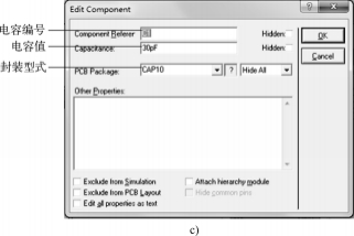雙擊元器件后可以打開(kāi)“Edit Component”(元器件編輯)對(duì)話框,并在其中設(shè)置元器件的參數(shù),如電容的編號(hào)、電容值和封裝形式等,如圖9-6c所示。