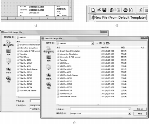 c)圖樣模板上的設(shè)計(jì)信息d)新建設(shè)計(jì)的快捷菜單e)“Load ISIS Design File”和“Save ISIS Design File”對(duì)話框