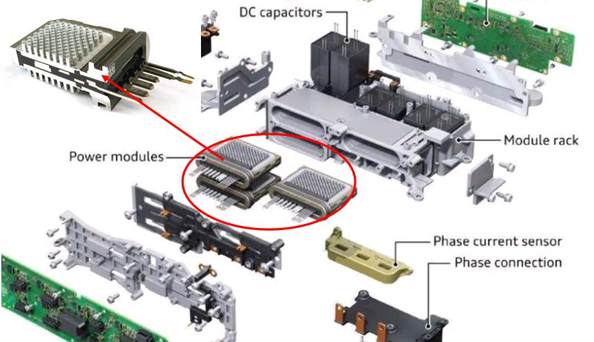 ST為特斯拉打造的逆變器由24個(gè)1合1功率模塊組成,模塊封裝在Pin Fin散熱片上。每個(gè)模塊包含兩個(gè)采用片芯連接解決方案的SiC MOSFET,并通過銅夾直接連接在端子上,以利用銅基板散熱,降低傳導(dǎo)損耗和開關(guān)損耗。