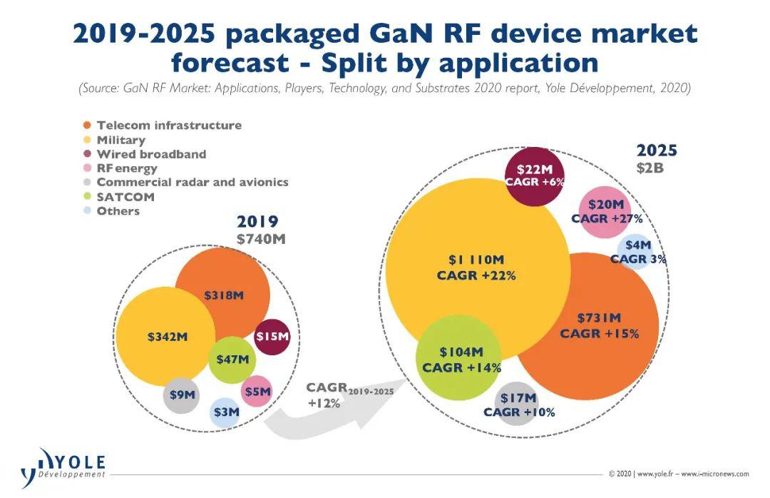 氮化鎵材料在射頻器件和電力電子器件兩個領域大放異彩。射頻器件產品包括功率放大器(PA)、低噪聲放大器(LNA)、射頻開關器、單片微波集成芯片(MMIC)等,在5G基站、衛(wèi)星、雷達和通信設備等領域應用廣泛。據(jù)Yole預測,2019年到2025年GaN RF器件的應用市場復合增長率將會達到12%。氮化鎵電力電子器件則更加適用于高頻率、小體積、低成本、功率要求低的情況,主要應用方向集中在快充電源市場。