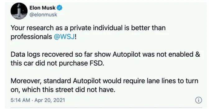 近日,美國(guó)德州一輛特斯拉事故造成兩人傷亡,美國(guó)監(jiān)管部門正在審查特斯拉。馬斯克表示:“……目前恢復(fù)的數(shù)據(jù)日志顯示Autopilot沒(méi)有打開(kāi),而且這輛車沒(méi)有購(gòu)買FSD(全自動(dòng)駕駛系統(tǒng))。此外,標(biāo)準(zhǔn)自動(dòng)駕駛系統(tǒng)需要車道線才能打開(kāi),而這此次事發(fā)的街道沒(méi)有車道線?!甭?tīng)懂了嗎?駕駛者全責(zé)!