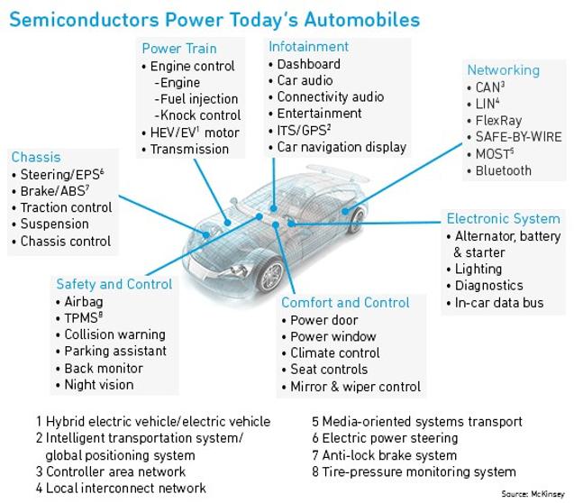 圖3:嵌入式電子,尤其時半導體,在現(xiàn)代車輛中幾乎用于控制所有操作(圖源:麥肯錫公司)