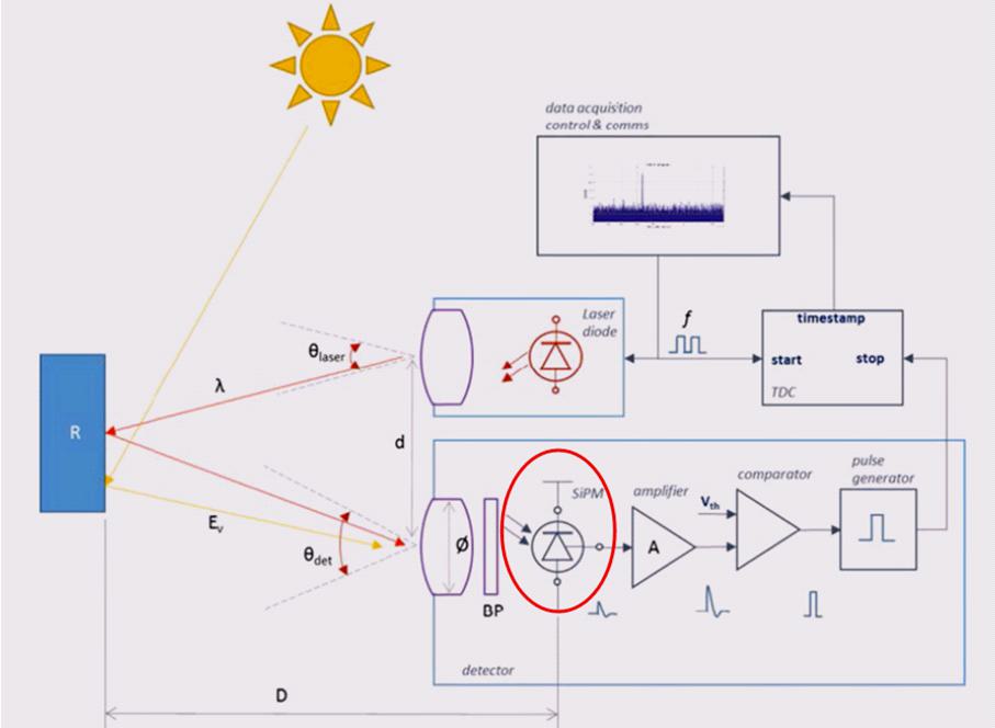 為了滿足激光雷達(dá)更遠(yuǎn)距離要求,實(shí)現(xiàn)超低目標(biāo)反射率探測(cè),抑制環(huán)境光等噪聲,同時(shí)大幅度降低整體成本,安森美半導(dǎo)體基于硅基單光子探測(cè)器芯片,大力推廣基于硅光電倍增管(SiPM)探測(cè)器+近紅外(NIR)波長(zhǎng)+直接飛行時(shí)間(dToF)的激光雷達(dá)方案。
