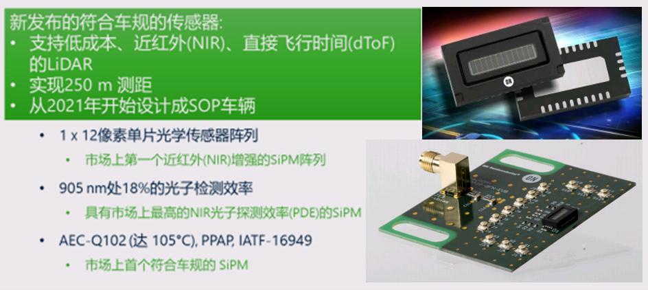 SiPM和SPAD(單光子雪崩二極管)探測(cè)器是2018年收購(gòu)SensL所得。SiPM是一種建立在SPAD上的探測(cè)器,對(duì)單個(gè)光子非常敏感,能夠在陽光直射環(huán)境條件下工作,有助于系統(tǒng)探測(cè)到最遠(yuǎn)的物體,即使反射率最小?;赟PAD陣列的飛行時(shí)間圖像傳感器可以實(shí)現(xiàn)高分辨率4D成像,從場(chǎng)景中的所有點(diǎn)同時(shí)捕獲深度數(shù)據(jù)和強(qiáng)度。