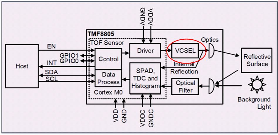 dToF傳感器基于SPAD像素設(shè)計(jì)和具有極窄脈沖寬度的時(shí)間數(shù)字轉(zhuǎn)換轉(zhuǎn)換器(TDC),實(shí)時(shí)測(cè)量VCSEL發(fā)射并從物體反射的紅外射線的飛行時(shí)間。低功耗飛行時(shí)間傳感技術(shù)有助于主機(jī)系統(tǒng)精確、高速地測(cè)量距離。