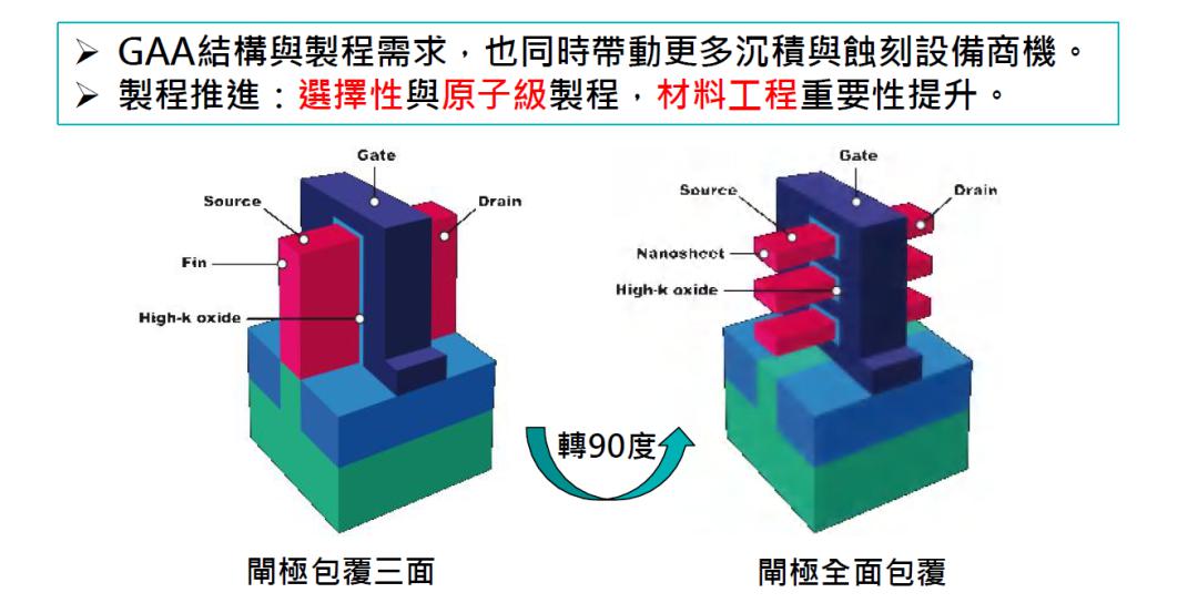 由于新的結(jié)構(gòu)所需的生產(chǎn)工藝與鰭式晶體管相似,關(guān)鍵工藝步驟幾乎一樣,可以繼續(xù)使用現(xiàn)有的設(shè)備以及技術(shù)成果,對臺積電和三星而言,這無疑是代價(jià)最低的技術(shù)路線更換方案。但GAA對加工精度要求進(jìn)一步提高,需要區(qū)域選擇性沉積技術(shù)與原子級加工能力,因而材料工程重要性提升,也將帶動更多沉積與蝕刻設(shè)備商機(jī)。