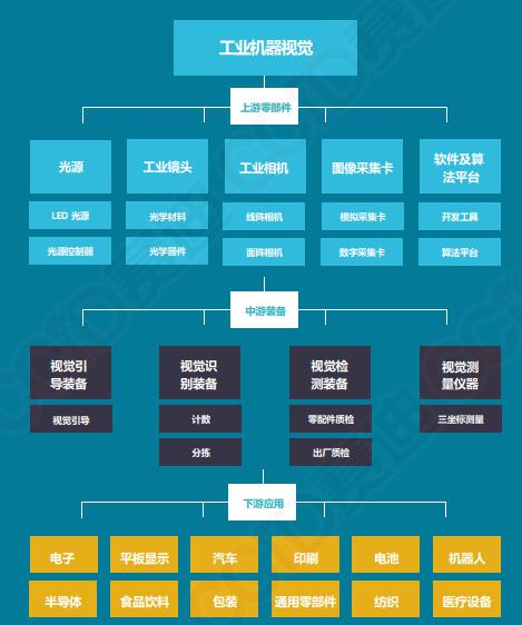 機(jī)器視覺市場發(fā)展前景廣闊,產(chǎn)業(yè)鏈上中下游都蘊(yùn)藏著巨大的發(fā)展?jié)摿?。上游包括光源、工業(yè)鏡頭、工業(yè)相機(jī)、圖像采集卡等核心零部件,以及圖像處理和算法平臺等軟件;中游分為裝備制造商和系統(tǒng)集成商,涵蓋引導(dǎo)、測量、檢測、識別等儀器裝備;下游應(yīng)用包括消費(fèi)電子、工業(yè)、半導(dǎo)體、汽車制造、食品包裝、醫(yī)療設(shè)備等領(lǐng)域。