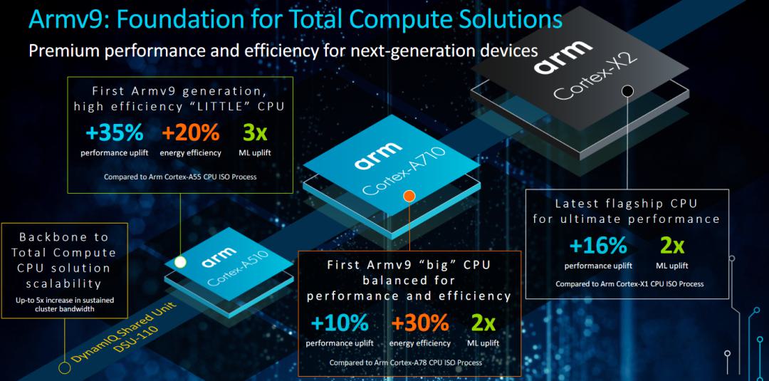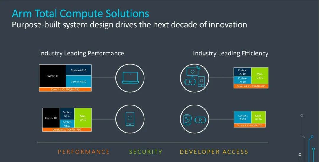 5月26日,Arm公司舉行產(chǎn)品發(fā)布會(huì),發(fā)布多款產(chǎn)品,包括首批Armv9 Cortex CPU內(nèi)核、新款圖像處理器Mali內(nèi)核,以及互連技術(shù)CoreLink的最新版本。籍此“史上最大產(chǎn)品發(fā)布會(huì)”(Paul Williamson語)推出的系列產(chǎn)品,Arm也正式推出首款全面計(jì)算(total compute)解決方案,希望借助移動(dòng)生態(tài)系統(tǒng)帶來的巨大規(guī)模優(yōu)勢(shì),為開發(fā)者提供從IP、軟件到開發(fā)工具的全面解決方案,讓Arm技術(shù)在云計(jì)算中心、筆記本和臺(tái)式機(jī),以及移動(dòng)設(shè)備中無縫對(duì)接,在依靠半導(dǎo)體工藝升級(jí)提升性能程度日益走低的背景下,Arm也將帶動(dòng)開發(fā)者更多地從系統(tǒng)角度來提升SoC(系統(tǒng)級(jí)芯片)性能,打造性能更優(yōu)、可擴(kuò)展性更佳、安全性更一致的全面計(jì)算生態(tài)。