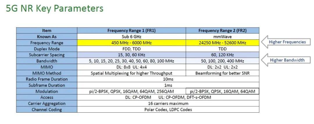 眾所周知,目前全球采用兩種不同頻段部署5G網(wǎng)絡(luò),即3GPP劃分的FR1頻段和FR2頻段,其中FR1頻段范圍為450MHz-6GHz,最大帶寬100MHz,被稱為Sub-6GHz頻段;FR2頻段范圍為24.25GHz-52.6GHz,最大帶寬400MHz,被稱為毫米波頻段,兩者共同組成了5G頻段。