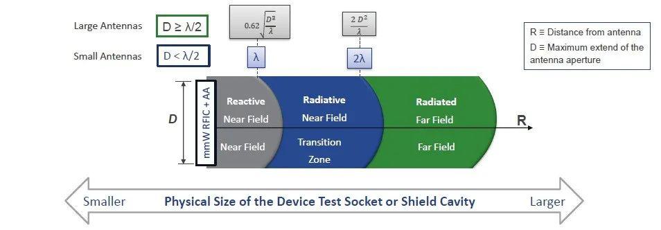 OTA測試也被稱作“空口測試”。眾所周知,天線是信號到自由空間的轉(zhuǎn)換器和接口,大天線封裝孔徑一般大于1/2波長,小天線一般小于1/2波長。由于電磁場的特性與天線的距離密切相關(guān),所以天線測試一般又分為近場測試和遠(yuǎn)場測試。進(jìn)一步細(xì)分的話,場區(qū)又會被分為“反應(yīng)區(qū)”和“輻射區(qū)”,反應(yīng)區(qū)里電場和磁場的能量最強,電磁波相對較弱;遠(yuǎn)場基本是真正意義上的電磁波輻射了,輻射形式不會隨著距離改變,它在大氣中以3億米/秒的速度傳播, 兩者之間被稱之為“過渡區(qū)”。