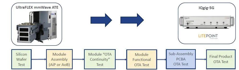 其中,CP測試、OTA連通測試和最終成品OTA測試,是大規(guī)模量產(chǎn)中必須包含的。泰瑞達(dá)的UltraFlex 毫米波板卡和LitePoint IQgig5G在不同的測試階段可以提供相應(yīng)的毫米波測試解決方案。