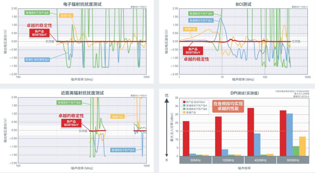本次發(fā)布的新產(chǎn)品經(jīng)過(guò)了電子輻射抗擾度測(cè)試、BCI測(cè)試、近距離輻射抗擾度測(cè)試與DPI測(cè)試,并在這四種國(guó)際抗擾度評(píng)估測(cè)試中表現(xiàn)出色。此外,該產(chǎn)品配備了羅姆自有的高精度仿真建模技術(shù),使仿真值與實(shí)際值完全一致,完全再現(xiàn)系統(tǒng)特性,防止仿真值與實(shí)際值誤差太大導(dǎo)致頻繁返工,也提高了應(yīng)用產(chǎn)品的開(kāi)發(fā)效率,節(jié)約了開(kāi)發(fā)成本。